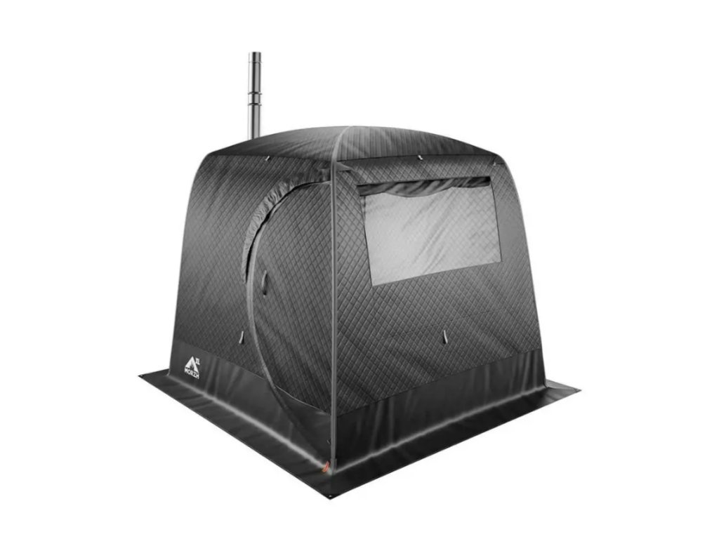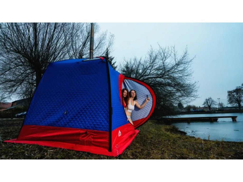 Mobilní stanová sauna z třívrstvého materiálu prošívaného technologií Thermosteck. Materiál se skládá z vnější voděodolné vrstvy OXFORD240, střední patentované izolační vrstvy Siberia a vnitřní lehké, ale pevné látky Taft. Tento materiál zaručuje rychlejší vyhřátí, delší udržení tepla a menší spotřebu paliva, než jednovrstvé varianty. Vyrobeno a testováno na Sibiři, takže ani v extrémních mrazech není problém saunu vyhřát na 100 i více stupňů během 20-30 minut.